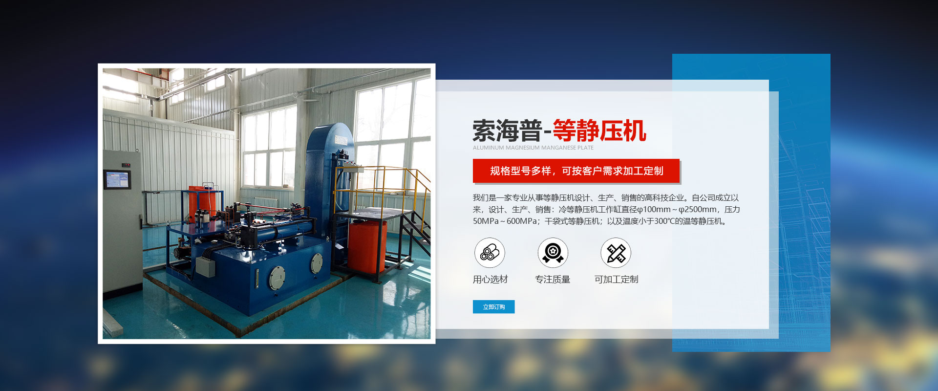四川索海普注冊于四川省成都市武侯區(qū),是一家專業(yè)從事等靜壓機設計、生產、銷售的高科技企業(yè)。自公司成立以來,設計、生產、銷售:冷等靜壓機工作缸直徑φ100mm~φ2500mm,壓力50MPa~600MPa;干袋式等靜壓機;以及溫度小于300℃的溫等靜壓機。